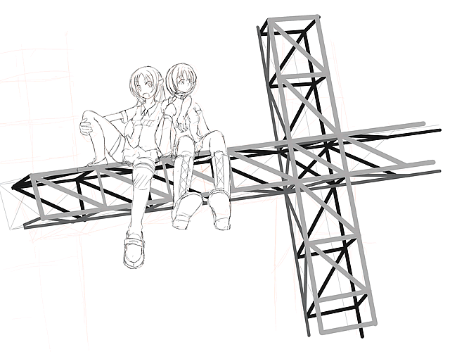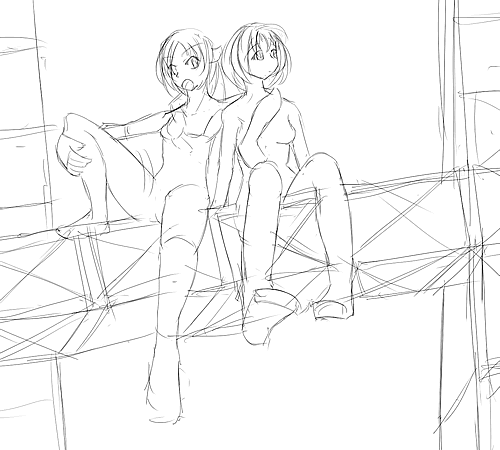 背景のパースというか人物との整合性とれてるのだろうか。構図がなんとなく前描いたのとにたよーな感じに・・・。@服装とかあんま思いつかない。よくファッション誌見て~とか言うけど 参考になりそうなの買ってこようかな。